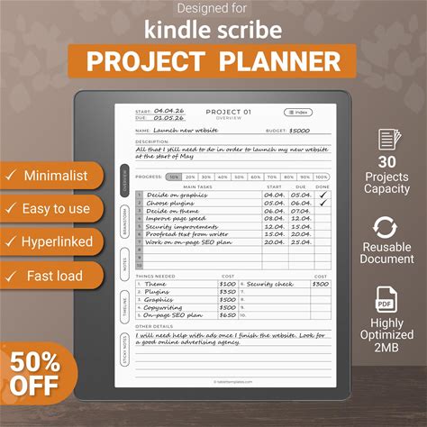 Project Planner For Kindle Scribe Tablet, Undated, Hyperlinked PDF Template