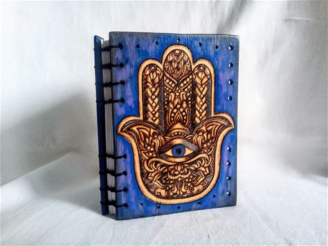 Hamsa Hand Evil Eye, Hand Of Fatima, Pyrography Blue Wood Notebook, Magic Amulet Gift, Travelers Notebook A5, Bullet Journal Notebook
